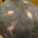 Очаговая форма сопровождается, соответственно, локальным выпадением волос, с круглыми или овальными зонами облысения.